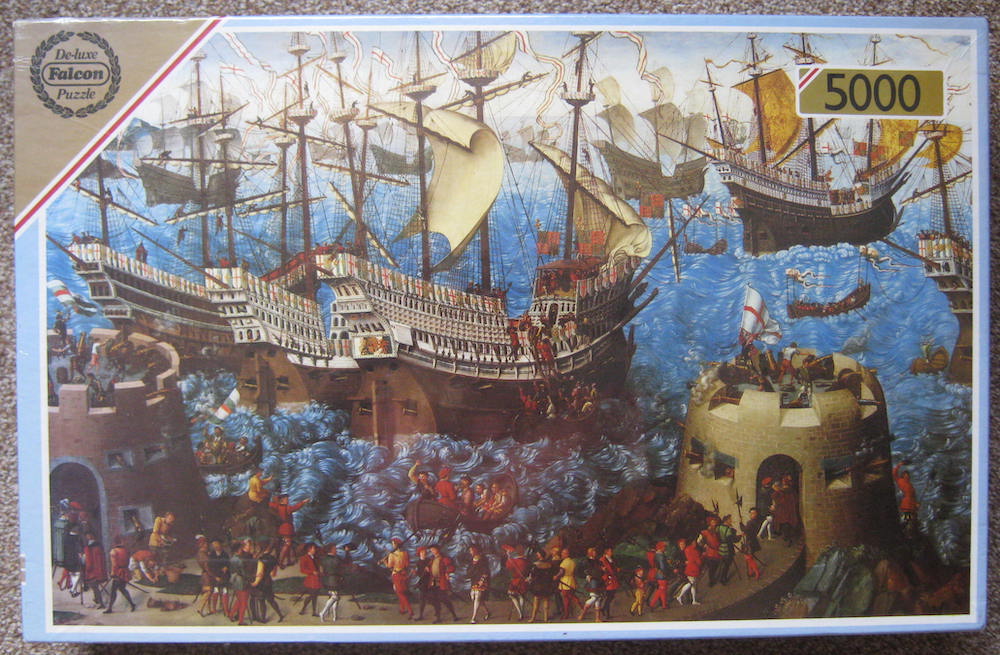 This is an excellent large classic puzzle by Falcon. The title is The Embarkation of Henry VIII at Dover. The painting shows Henry VIII and his fleet setting sail from Dover to Calais on 31 May 1520 on the way to meet Francis I at The Field of Cloth of Gold. The artist of the painting is James Basire the Elder. Thank you very much, @p-birkett, for finding out about the author.