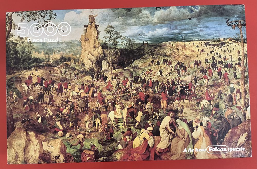 This is an extremely rare puzzle and very difficult to find. Most of large fine arts jigsaw puzzles by Falcon are very rare now. This one depicts the Procession to Calvary, by Pieter Bruegel the Elder.