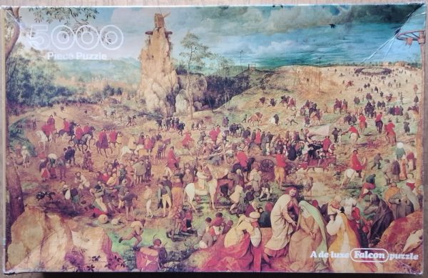 This is an extremely rare puzzle and very difficult to find. Most of large fine arts jigsaw puzzles by Falcon are very rare now. This one depicts the Procession to Calvary, by Pieter Bruegel the Elder.