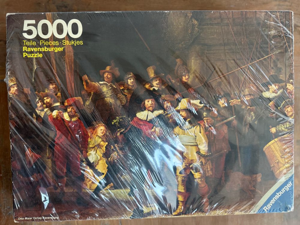 Ravensburger produced this puzzle in 1977, so it has been out of catalog for a long time. It still appears every now and then, but it is unusual to find it in this condition. It represents the famous painting The Night Watch, by Rembrandt van Rijn. You can admire the original artwork in the Rijksmuseum, Amsterdam.