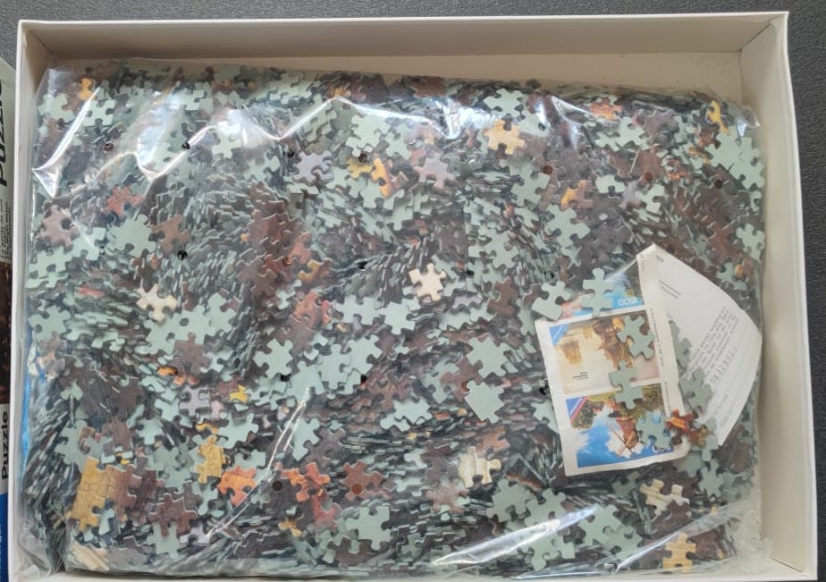 The puzzle is like NEW, with all the pieces SEALED inside the original plastic bag. The box is in very good condition, with some shelf wear.