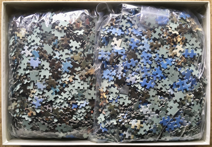 The puzzle is COMPLETE (5040 pieces). The pieces are in excellent condition, except for 1 piece with very minor damage, as you can see in the photograph. The box is in very good condition, with some shelf wear.