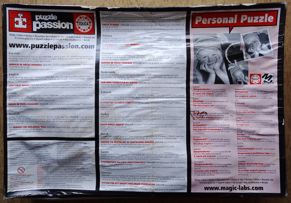 The puzzle is COMPLETE (6000 pieces). The pieces are in excellent condition, except for 2 pieces with minor damage that have been repaired, as you can see in the photographs. The box is in good condition, although the base has damage.