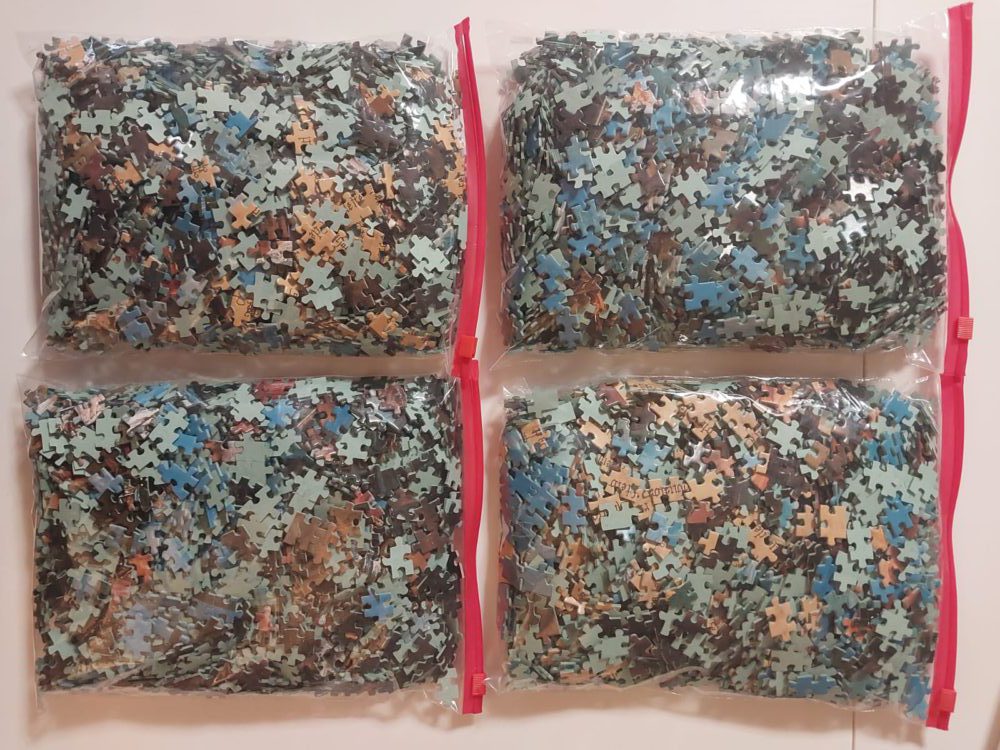 This puzzle is COMPLETE, as you can see in the photograph of the puzzle assembled. The pieces are in excellent condition. The box is in very good condition, with some shelf wear. The pieces are divided in 4 bags corresponding to 4 sections of the puzzle, so you can assemble it in parts.