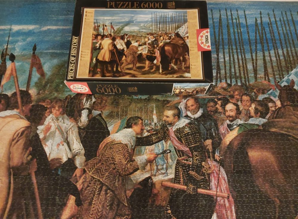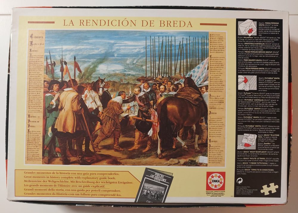 Educa manufactured this beautiful puzzle in 1998. Later, the company issued a larger version with 10000 pieces. It depicts the famous painting The Surrender of Breda, also known as Las Lanzas, by the Spanish artist Diego Velázquez.
