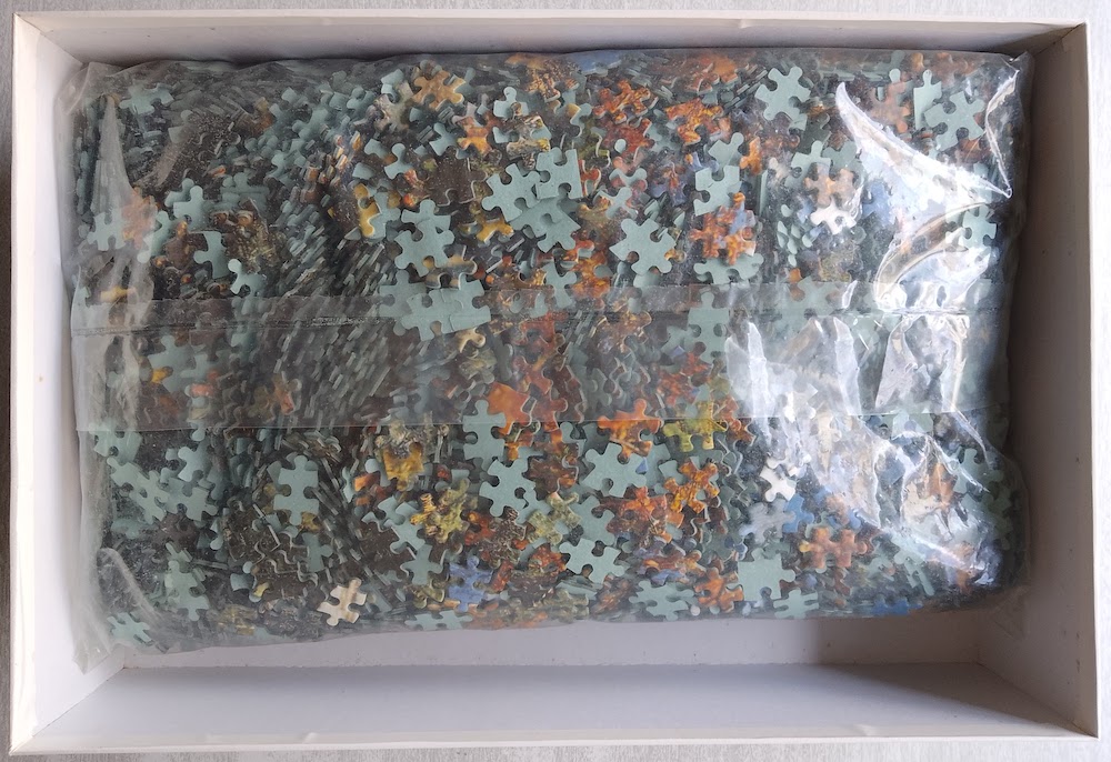 The puzzle is like NEW, with all the pieces SEALED inside the original plastic bag. The box is in very good condition, with some shelf wear and a tear on a corner of the lid.