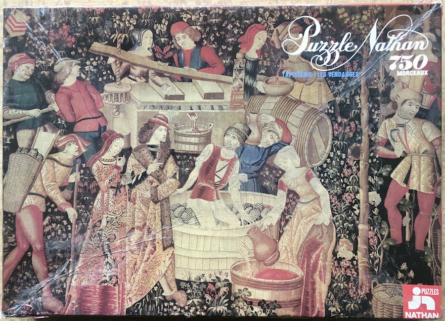 Nathan manufactured this rare puzzle in 1977. The puzzle represents a fragment of the famous tapestry Les Vendanges, or The Grape Harvest Tapestry. The complete tapestry shows the different stages of wine making. The tapestry is currently at the Musée de Cluny, or National Museum of the Middle Ages, in Paris, France.