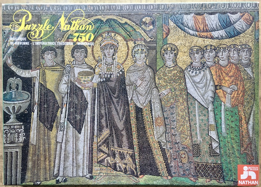Nathan manufactured this beautiful puzzle in 1977. The title on the box is Ravenna Mosaic, but it is the Mosaic of Empress Theodora, in the Basilica of San Vitale, Ravenna.
