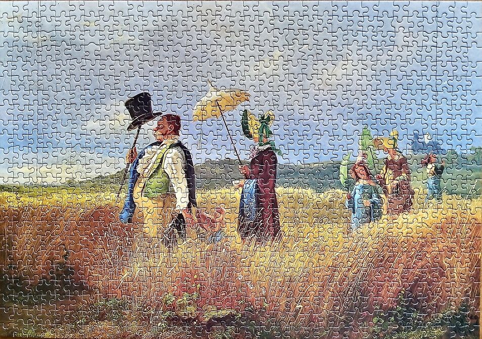 Ravensburger manufactured this rare puzzle in 1977. The title is Family Outing, by the 19th century romanticist painter Carl Spitzweg.