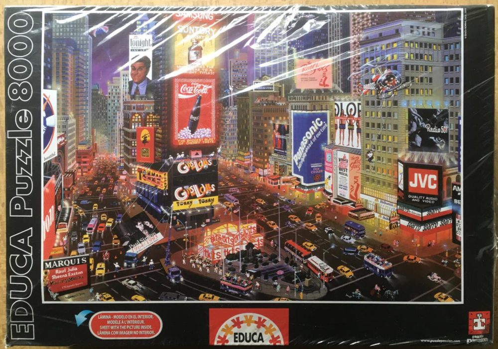 Educa manufactured this puzzle in 2015. The title is An Evening in Times Square, by Alexander Chen. It is a very interesting piece of art, because it looks very realistic from a distance, and, at the same time, it resembles a cartoon painting when looking from a closer distance. It has a ton of colors and details, so it will make a great puzzling experience.