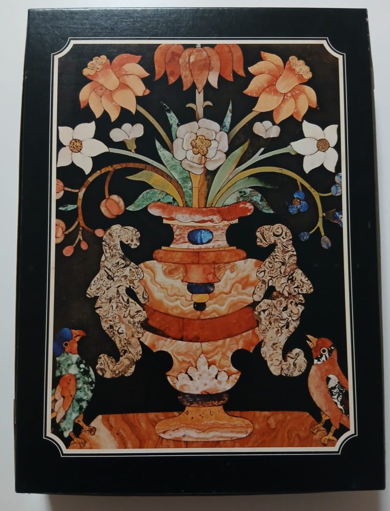 Ravensburger manufactured this intriguing puzzle in 1981. The title is Vase of Flowers. It depicts a Florentine pietra dura plaque of finely cut and polished colored semi-precious stones laid onto a marble surface. The plaque represents a vase of flowers flanked with two birds.